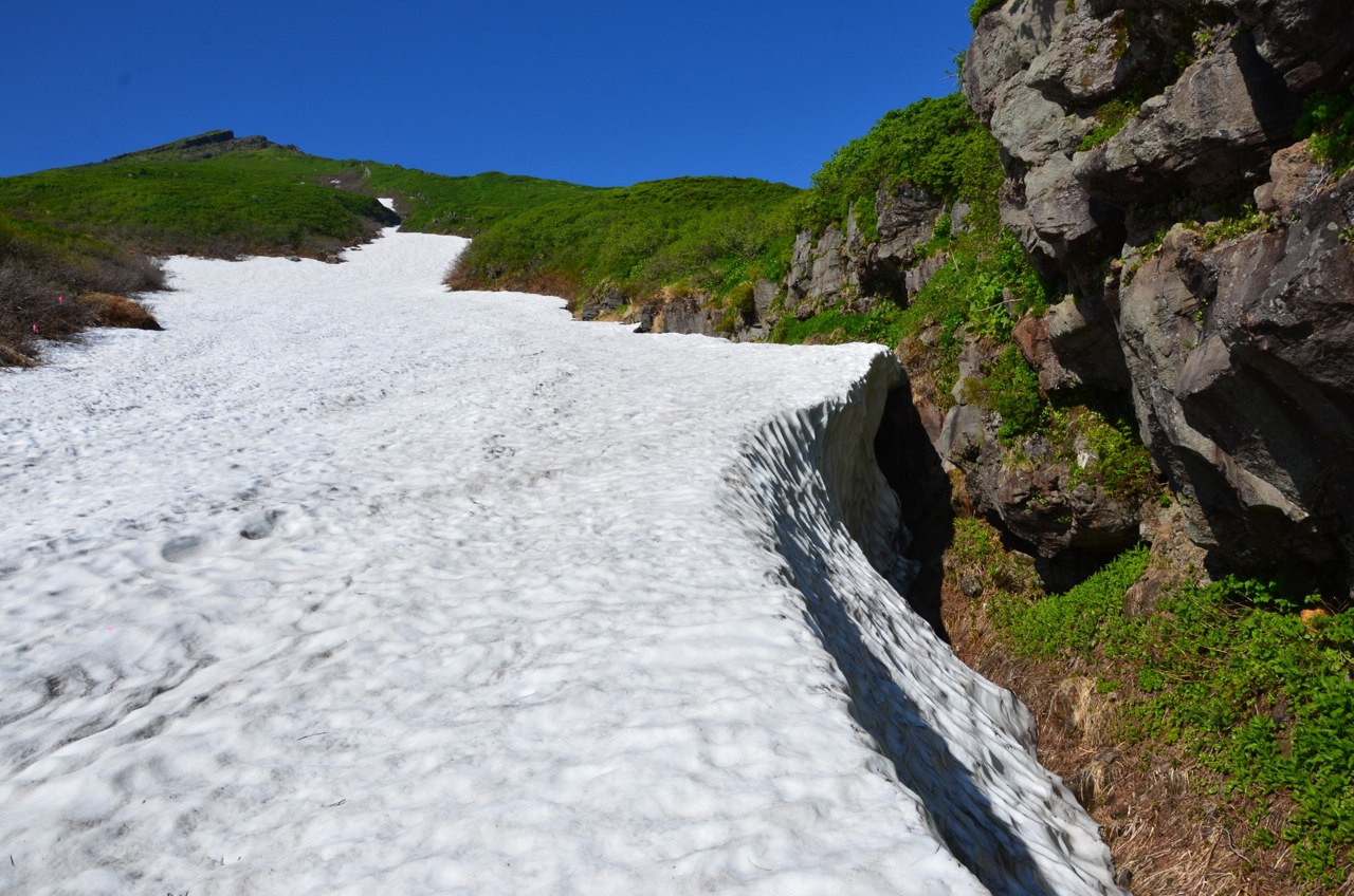 竜ヶ原湿原の木道を抜けて登りにさしかかると、いきなり雪渓が現れてびびる。それをクリアしたと思ったのも束の間、またすぐに巨大な雪渓が出現する。結構な急斜面だ。見上げると、先行する学生5人組がアイゼンなしで滑りまくっている。せっかく持ってきたことだし、4本爪の軽アイゼンを装着してみる。