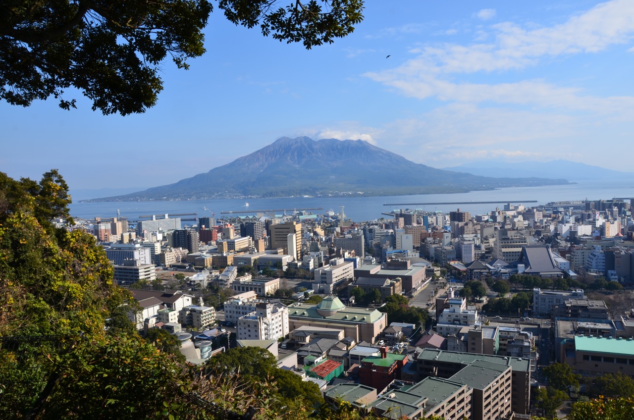 鹿児島・城山展望台より桜島 背後に大隅半島の高隈山(大篦柄岳 1236m)が聳える