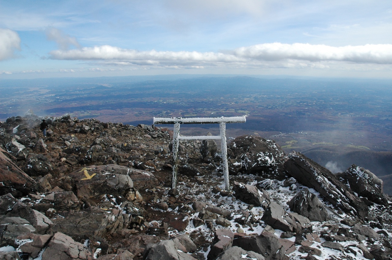 元来た道を引き返し、気を取り直して山頂を目指す。岩でガラガラの道を登っていき、鳥居をくぐると、小さな祠のある茶臼岳山頂に着いた。