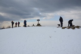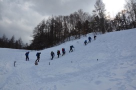 雪上訓練をしている人たちを横目に、雪の斜面をよじ登る。岩場コースと迂回コースに別れるが、岩場コースを行くことにする。標識の埋まり具合からして、かなりの積雪のようだ。
