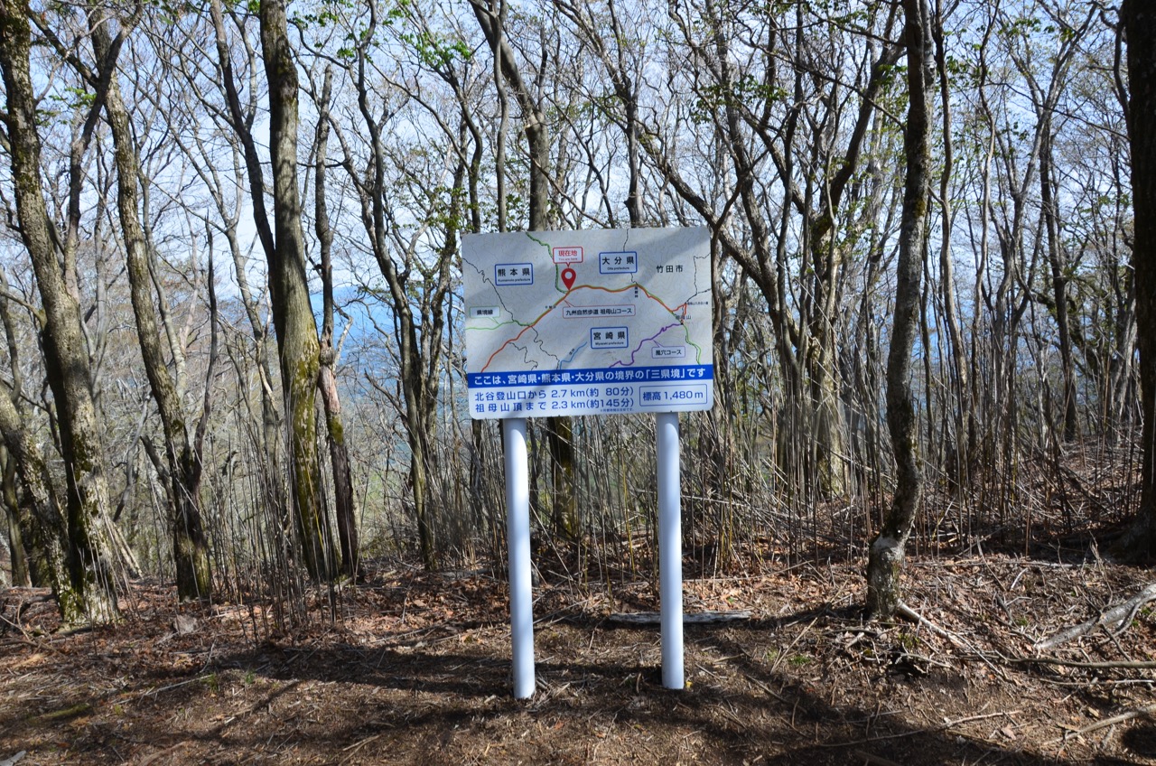 五合目付近に、宮崎・熊本・大分の「三県境」がある。三県境は全国に44箇所しかないから、かなりレアな場所だ。(厳密に言うと、和歌山県に飛び地があるため和歌山・奈良県・三重の三県境は5箇所もあり、それも合わせると48箇所となる。雲取山、甲武信ヶ岳の山頂も三県境だ。)