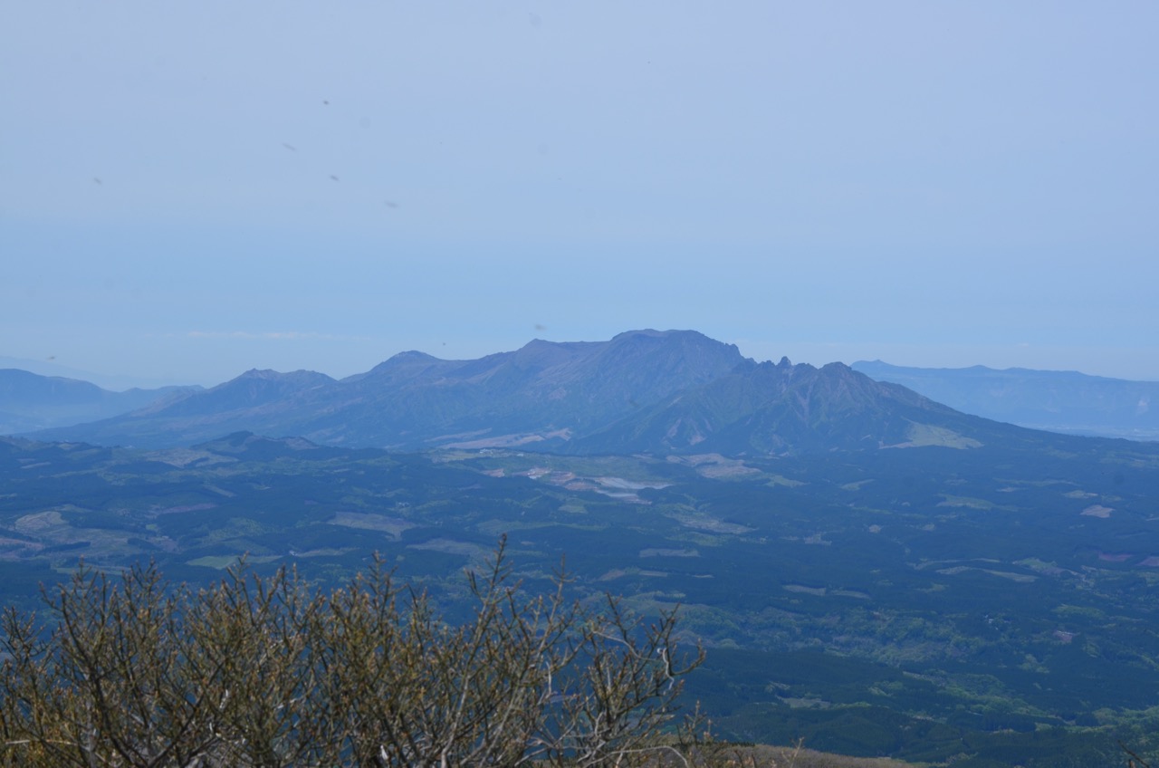 赤茶けた阿蘇山は、根子岳の鋭いピークが天を突く。ギザギザの九重連山の隣には、由布岳と鶴見岳が意外に近い。